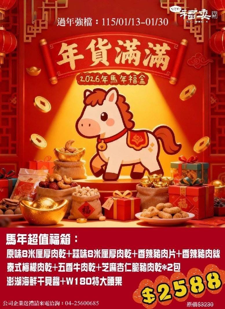 超值馬年福箱原味8米厘厚肉乾1包蒜味8米厘厚肉乾1包香辣豬肉片1包香辣豬肉絲1包泰式檸檬肉乾1包五香牛肉乾1包芝麻杏仁脆豬肉乾2包️澎湖海鮮干貝醬️W180特大腰果只要優惠價$2,588原價$3,230結帳輸入優惠碼famifree 享全家超商取貨付款免運..