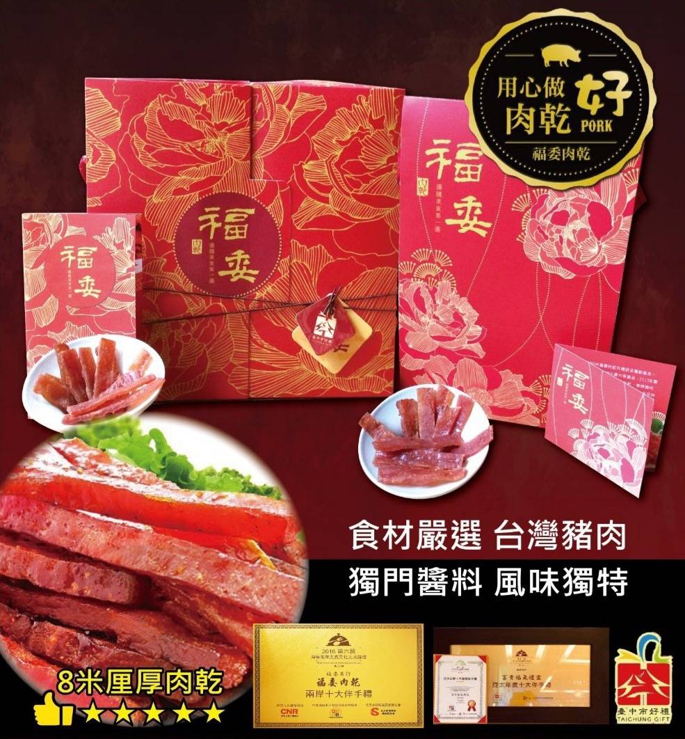 【品牌故事】福委肉乾位於臺中市大雅區,以團購優質肉乾名產打響名號,深受各公司福利委員會的喜愛。堅持古早味,堅持台灣豬,與老師傅在於食材、香料、製作,每一分一毫的嚴選經千錘百鍊的料理工法,終於找到了小時候喜歡的幸福滋味。優良產品榮獲臺中市好禮,感受臺中市的熱情與感動!伴手禮選福委,就對了! ..