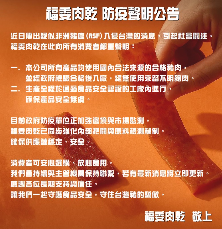 自2024/9/16起,我們將進行品項調整,韓式8米厘厚肉乾停止販售,感謝您長期以來對於福委肉乾的支持 福委肉乾使用的都是台灣產地的豬肉,敬請安心使用安全無虞! 好消息!2021福委肉乾榮獲亞太十大伴手禮獎